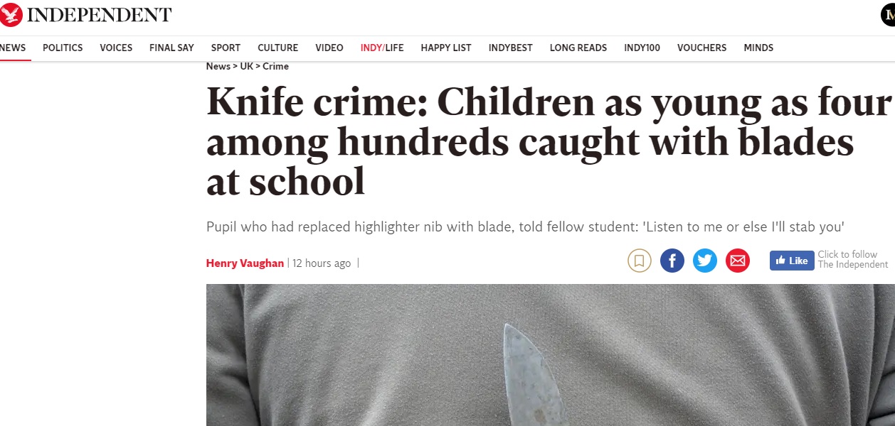 این نشریه انگلیسی در مطلبی در پایگاه اینترنتی خود نوشت: آمار و ارقام نشان می دهد در سال گذشته بیش از هزار کودک که کوچکترین آنها 4 سال داشته در مدارس چاقو به همراه داشته اند.