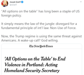 به گزارش سرویس بین الملل خبرگزاری صدا و سیما، محمد جواد ظریف وزیر امور خارجه کشورمان در حساب توئیتری خود با انتشار خبر مربوط به اظهارات سرپرست وزارت امنیت داخلی آمریکا که گفته بود " در زمینه مقابله با خشونت‌ها در پورتلند همه گزینه‌ها روی میز است"، نوشت: مدتهاست که عبارت "همه گزینه‌ها روی میزاست" یکی از پایه‌های سیاست خارجی آمریکا به شمار می‌آید. به بیان ساده این به معنای قانون جنگل و بی احترامی به یک اصل بنیادین قوانین بین المللی یعنی عدم استفاده از زور است. اکنون، رژیم ترامپ از همین تهدید علیه آمریکایی‌ها استفاده می‌کند. آیا این یک زنگ بیدارباش خواهد بود؟ اگر خدا بخواهد.