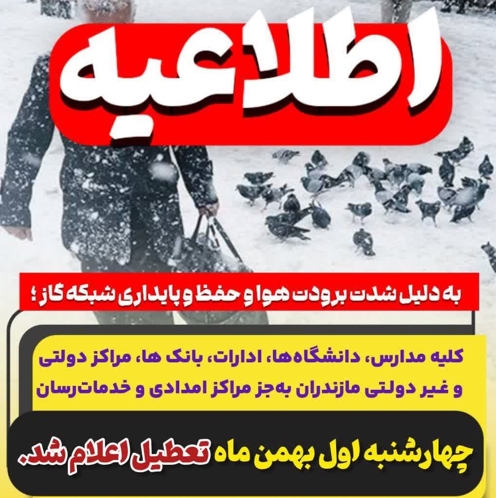 به گزارش خبرگزاری صدا و سیمای مازندران؛ معاون توسعه مدیریت و منابع استانداری مازندران گفت: با توجه به مصوبه کمیته اضطرار ستاد مدیریت بحران استان، به دلیل شدت برودت هوا و حفظ و پایداری شبکه گاز، همه موسسات آموزشی، اداری، بانکی و مراکز دولتی و غیردولتی به‌جز مراکز خدمات‌رسان روز چهارشنبه اول بهمن تعطیل است.